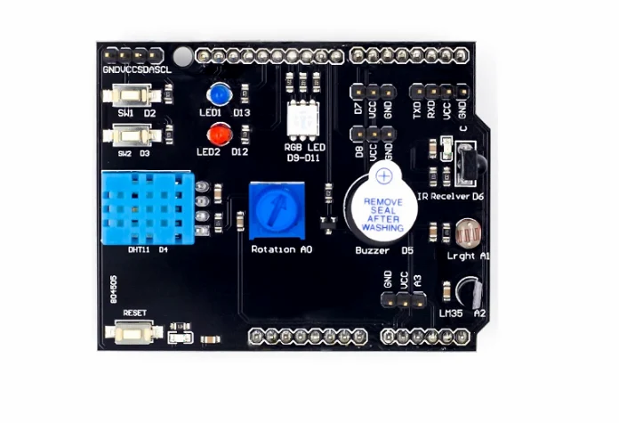 The board has an onboard DHT11 temperature and humidity sensor, an LM35 temperature sensor, an IR receiver, RGB led, etc. which are accessible through the I/O pins of the Arduino.